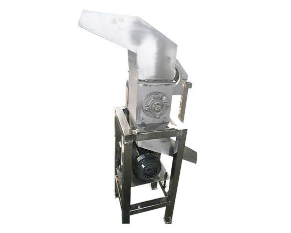 整机包含进出料斗、主机、机架、传动部件等,工作时电机经一对皮带轮等速驱动主轴高速旋转,主轴上装有若干把锤片。物料从升运机自由落入进料斗,被高速旋转的锤片切碎,由于离心力的作用,破碎后的物料颗粒由腰形的筛孔落入出料斗,然后由另配的螺杆泵泵入下道工序。