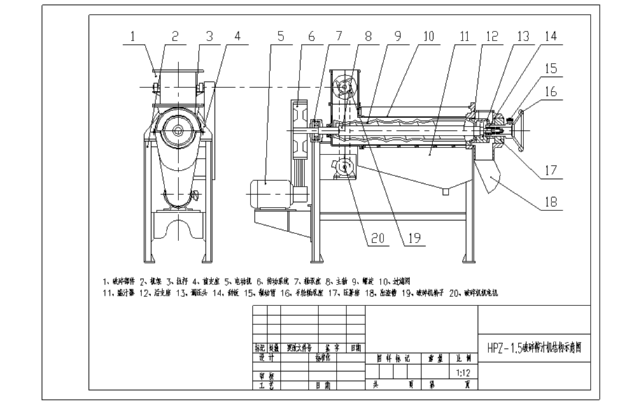 描 述:由前支座、进料斗、螺旋、过滤网、盛汁器、后支座、出渣槽等零件组成,螺旋主轴左端支承于滚动轴承座内,右端支承于手轮轴承座中,电动机通过一对三角皮带轮驱动螺旋进行工作。